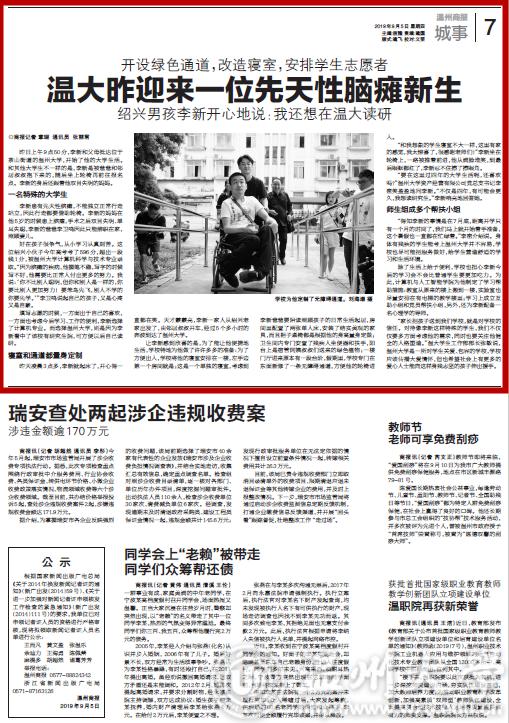 温州大学是一所对学生关爱、包容的学校,学校应该传播大爱情怀,但也希望社会上有更多的爱心人士能向这样身残志坚的孩子伸出援手。