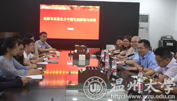 近日,由温州大学人文社科处主办、马克思主义学院和浙江省高校思政课卓高生名师工作室承办的学术沙龙活动在温州大学北校区行政楼举办。本次活动特邀北京大学马克思主义学院副院长、研究员、博士生导师陈培永做“当前马克思主义中国化的困境与破解”的主题演讲。温州大学马院副院长卓高生主持活动,副院长孙邦金教授、孙武安教授和部分青年教师及全体研究生、思政专业本科生参与。