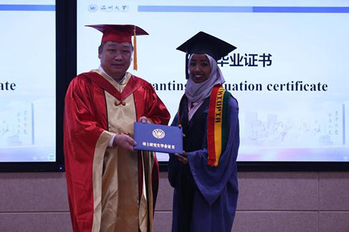 温州大学校长赵敏为埃塞俄比亚留学生阿法尔颁发毕业证书(李剑军 摄)