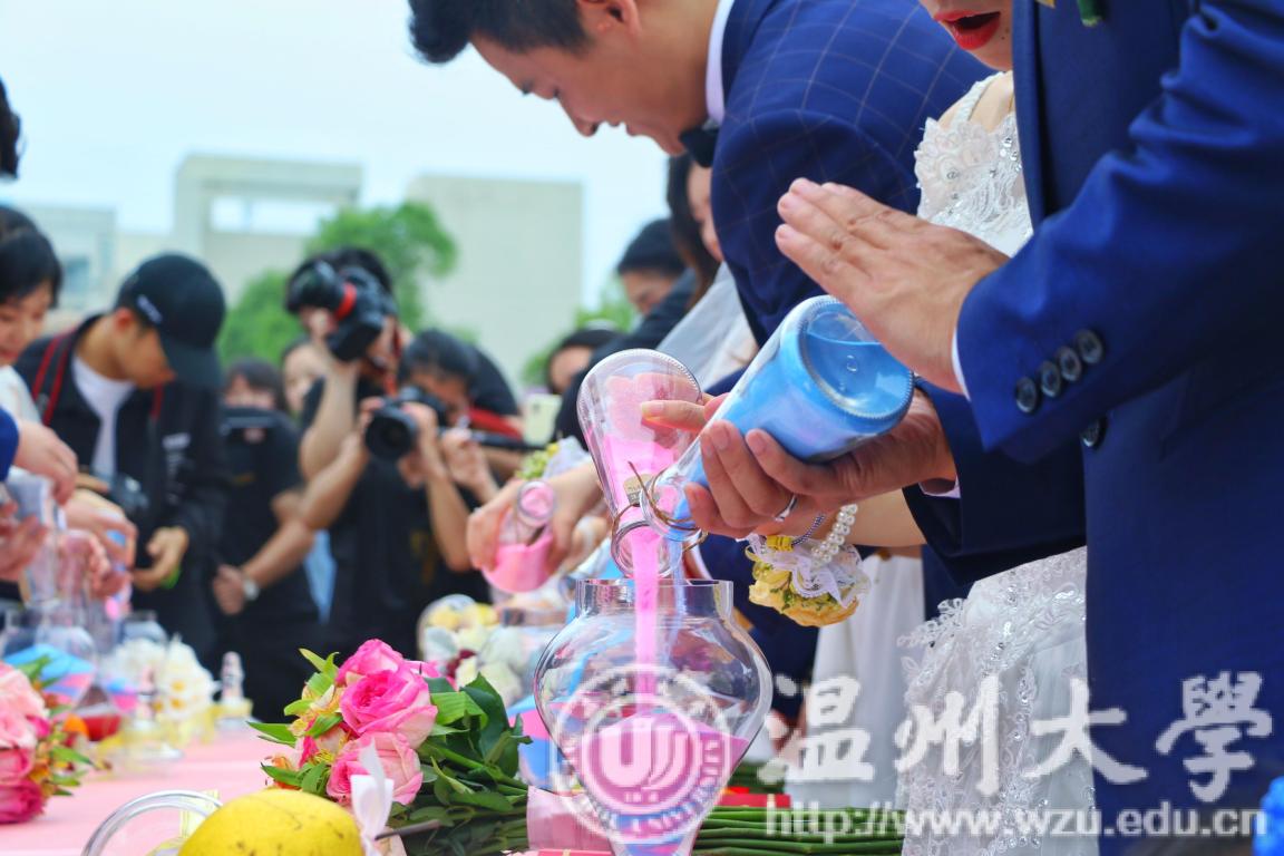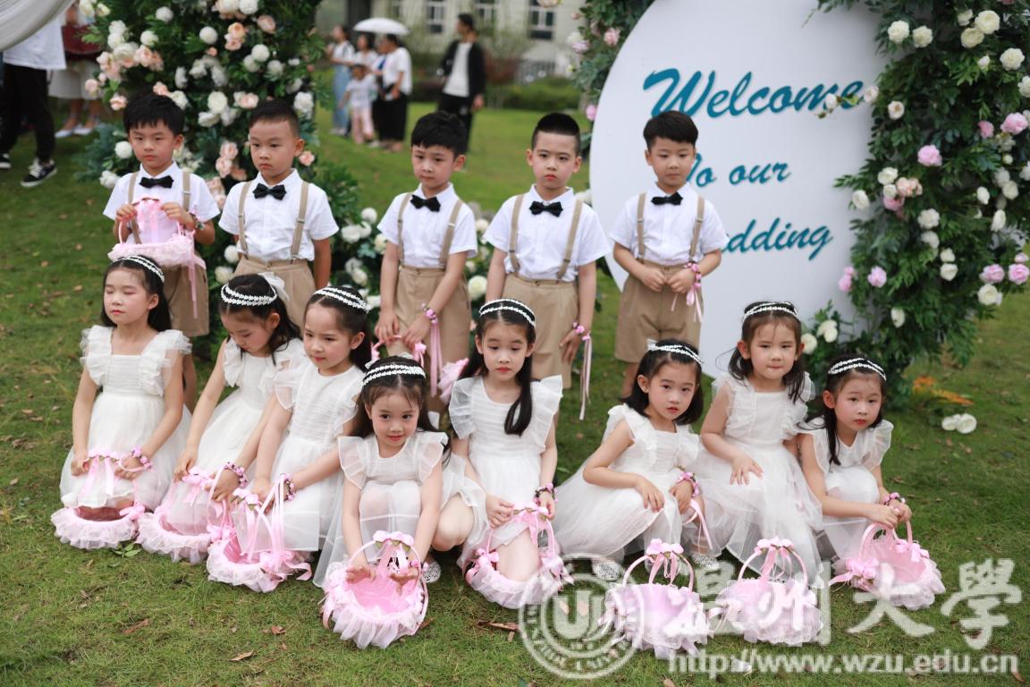 15对校友在百名师生的见证下,校长赵敏颁发结婚纪念证书,一同在温大校园里留下珍贵合影。温州大学附属实验幼儿园的小朋友们作为花童惊喜亮相,穿着漂亮的纱裙、帅气的西装,手携花篮,为每一对校友新人送上温州大学专属纪念戒指。每一位最想见的恩师也邀至婚礼现场,为校友们送上瓯柑、鸭梨,寓意“大吉大利”。