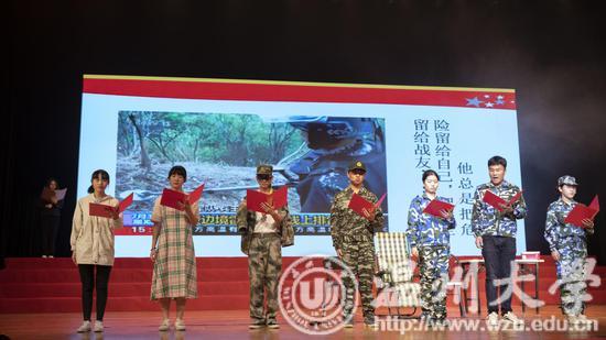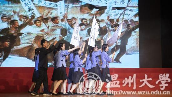 “同学们,快来看!这巴黎和会竟然暗箱操作!那些道貌岸然的政治家们要把德国在山东的权利全部划给日本!”愤怒的学生,高举横幅,走上街头,高喊口号:“还我青岛!还我主权!”……这是近日温州大学大学生思想政治风采大赛的精彩一幕,这段由教师教育学院十余位大一的学生表演的舞台情景剧《百年五四》,用还原历史、角色演绎的形式,生动再现了民族危难之际,爱国青年可歌可泣的故事,他们的表演,不仅赢得现场1200名师生的热烈掌声,甚至不少师生还激动地流下眼泪。