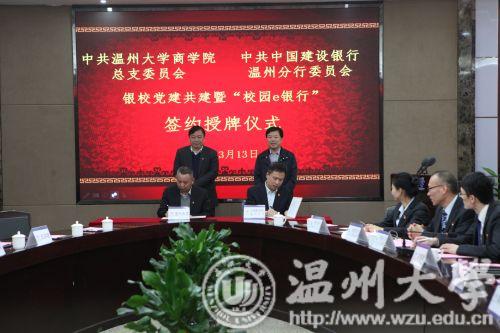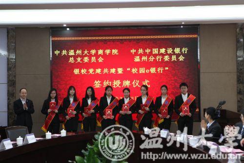 昨日下午,建设银行温州分行与温州大学商学院举行银校共建暨“校园e银行”签约授牌仪式。温州大学校长赵敏、建设银行浙江省分行副行长陈根海出席仪式并分别致辞。建设银行浙江省分行、温州分行和温州大学有关负责人及师生代表参加了签约授牌仪式。根据签约协议,共建双方将党建工作建立在银校合作项目上,创建国有银行、瓯越名校党建共建品牌。