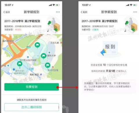 据了解,开学伊始,温州大学面向全体学生推出“GPS定位”报到系统,学生们线上就能完成报到手续。“操作其实很简单,每一步都有提示,报到只需1步就可以完成。”据温州大学学生处雷霞老师介绍,“GPS定位”报到的步骤很快捷,拿出手机下载“我的温大”app,在“我的应用”中的“更多”里面,点击“新学期报到”,就能成功完成报到。辅导员老师通过该软件“新学期报到模块”就能轻松掌握学生是否回到了学校,再也不用逐一核对相关证件信息。