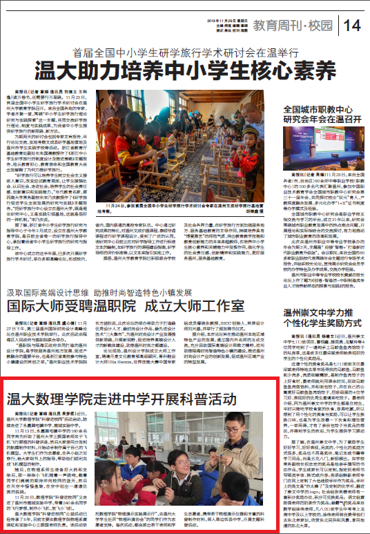 商报讯(记者章瑚 通讯员吴梦柔)近日,温州大学数理学院“科普进校园”活动启动,陆续走进了永嘉巽宅镇中学、鹿城实验中学。