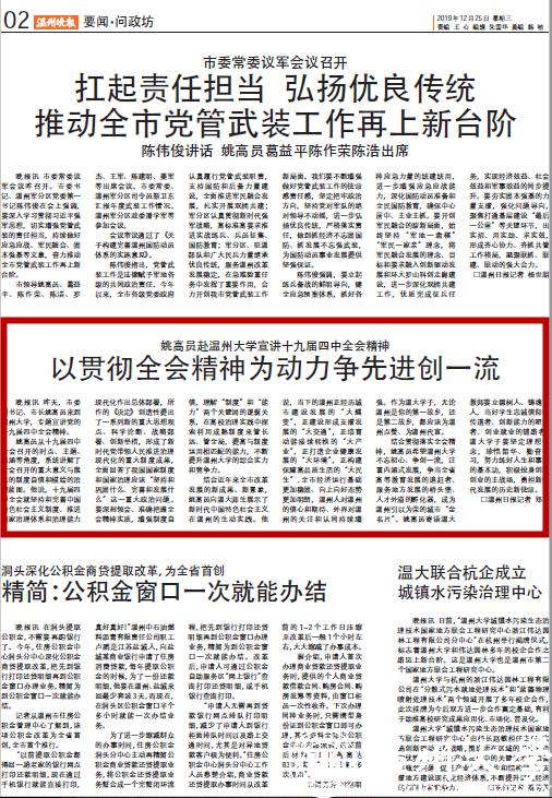 晚报讯昨天,市委副书记、市长姚高员来到温州大学,专题宣讲党的十九届四中全会精神。