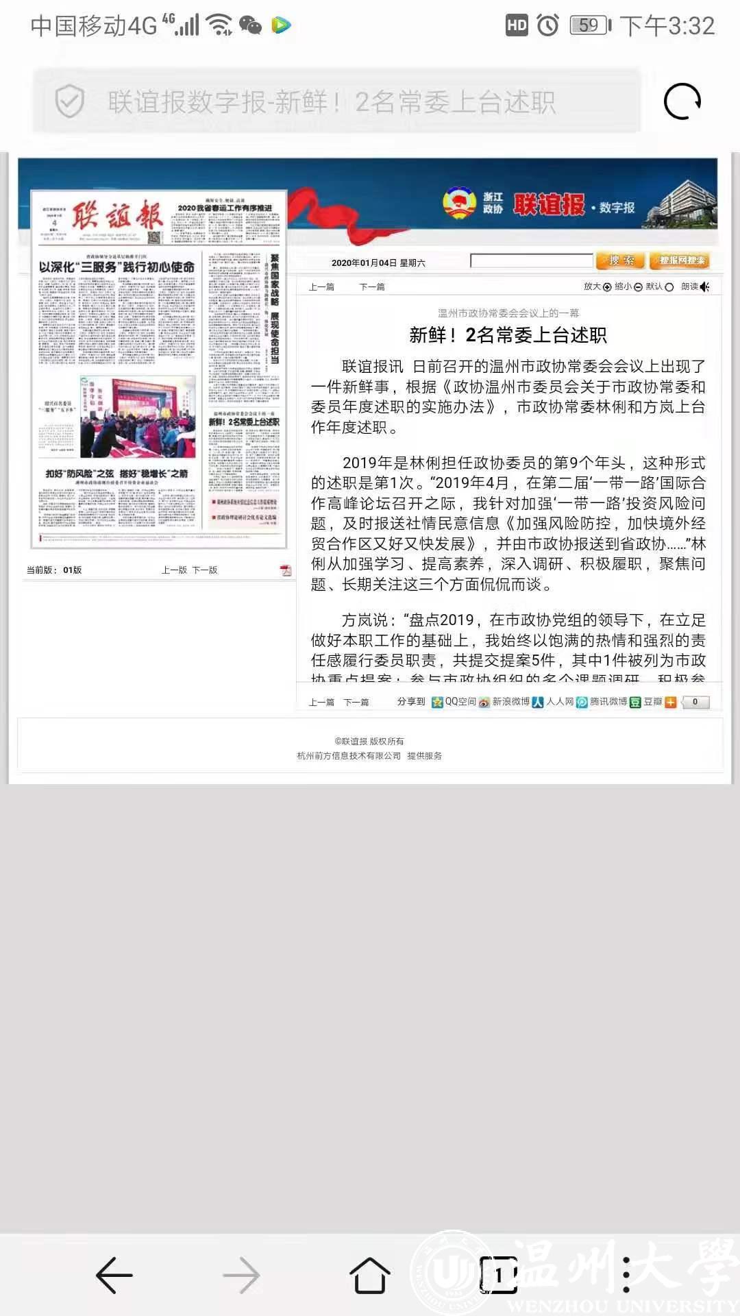联谊报讯 日前召开的温州市政协常委会会议上出现了一件新鲜事,根据《政协温州市委员会关于市政协常委和委员年度述职的实施办法》,市政协常委林俐和方岚上台作年度述职。