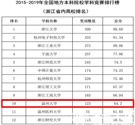 2月22日,全国普通高校学科竞赛排行榜(2015-2019年)发布,温州大学表现优异,在全国普通高校中位列第144,在全国地方本科院校中位列第84,在浙江省所有高校中位列第10。