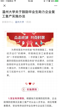 温州大学实施“一书、一信、一办法”,动员鼓励毕业生发挥专业优势,积极参与到复工复产中,为复工企业缓解用工困难,在实习实践中长才干、做贡献,抢占就业先机。