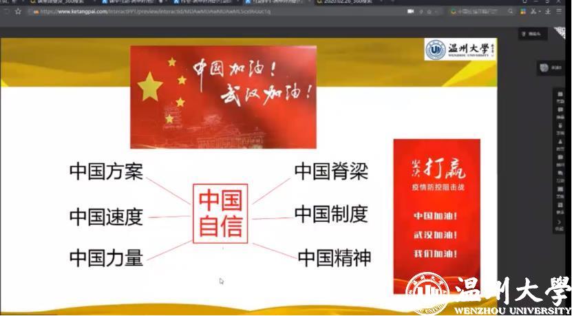 新学期伊始,温州大学迅速组建思政名师团队,开启思政课“三全”线上教学,实现在线“主播”思政全覆盖、思政第一课全新讲、在线思政课程全共享,为两万余名大学生上好“抗疫思政大课”,帮助大学生正确认识疫情、科学防范疫情、守法支持防控,引导大学生疫情阻击战中厚植爱国情怀,增强“四个意识”,坚定“四个自信”。在线上平台讨论区,同学们积极留言谈感想、讲心得、话体会,表达对战胜疫情的必胜信念和对中国特色社会主义的制度自信。来自湖北的唐双双同学说:“疫情使我切身体会到我们国家制度的优越性……我们依靠这样的制度优势,众志成城必将战胜2020年的新冠疫情。”