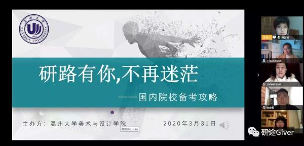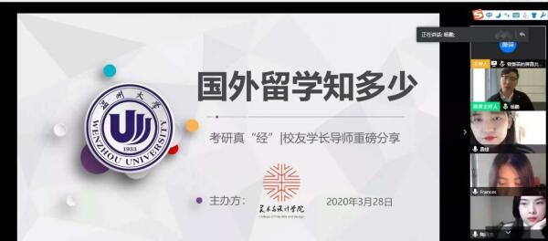 疫情不是暂停键,成长指导全在线。一个多月时间以来虽然“开学不返校”,但是245名本科毕业生的就业工作一直让温州大学美术与设计学院的老师们牵挂不已,尤其是对于学院立志考研和准备出国的学生,如何帮助他们顺利实现梦想?为了更好地指导学生学习规划和考研升学,近日,温州大学美术与设计学院在“云端”组建了一个实力不容小觑的导师团,聘请8位优秀校友担任“考研(留学)校友学长导师”,并且连续举办了2场“云”端传送考研(留学)真“经”的活动,参加学生近200人次。