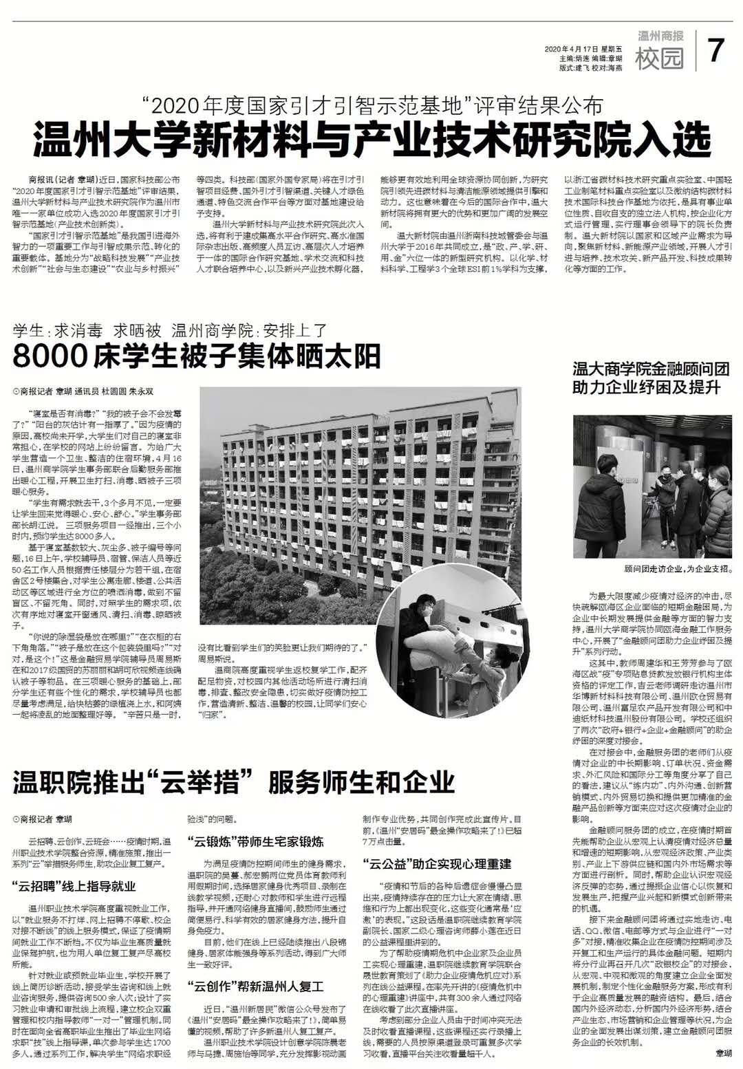 商报讯(记者 章瑚)近日,国家科技部公布“2020年度国家引才引智示范基地”评审结果,我校新材料与产业技术研究院作为温州市唯一一家单位成功入选2020年度国家引才引智示范基地(产业技术创新类)。