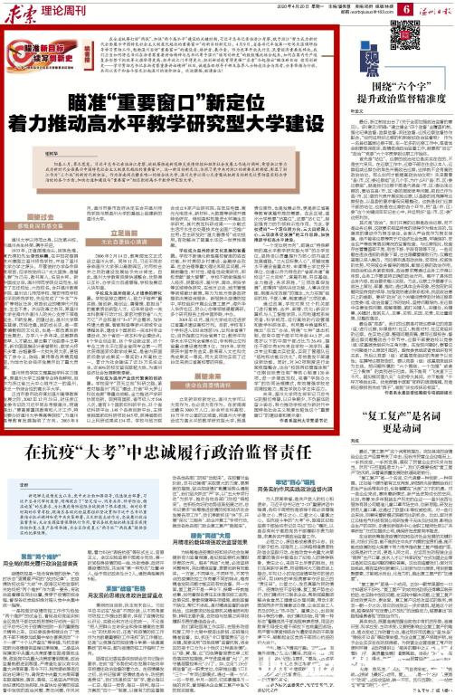 阳春三月,草木葱茏。习近平总书记亲临浙江考察,就统筹推进新冠肺炎疫情防控和经济社会发展工作进行调研,希望浙江努力成为新时代全面展示中国特色社会主义制度优越性的重要窗口。这一新目标新定位,体现了党中央对浙江的新要求新期望,彰显了浙江作为“三个地”的新时代新担当。作为浙南闽北赣东唯一的综合性大学,温州大学必须心无旁骛地把新目标新定位贯彻落实到办学治校的各个方面,加快打造和建设与“重要窗口”相匹配的高水平教学研究型大学。