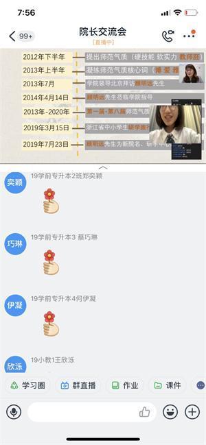本次交流会圆满落幕,师生互动反应良好,氛围十分浓厚,反响强烈,效果良好。学院有800多名学生参加了交流会,短短九十分钟直播中,互动信息数达1630次,直播点赞数达41010条。温州大学教育学院将以此为契机,陆续推出“‘同看慕课,共思教育’——亲近慕课,思考教育真谛”、“教育真人图书馆——校友教育真书”等活动。
