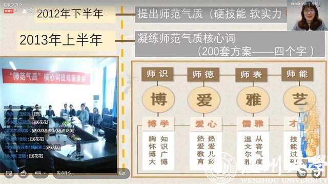 博览伴我同行,书香溢满教院。温州大学教育学院在第八届师范气质节中启动“读万卷书、亲万门课、行万里路、筑万人梦”的博学四万行动。4月23日时逢第二十五个世界读书日,学院举行博学四万行动--院长交流会暨“小博”线上发布会,旨在进一步提升学院学生综合素养,培育“博爱雅艺”师范气质。教育学院院长孙芙蓉教授回顾了学院师范气质的历程和著名教育家顾明远先生与我院师范气质的故事。她谈到,从2012到2020,学院坚持以师范气质作为人才培养长期方略,持续深化师范人才培养。学院的师范气质培养理念得到顾明远老先生高度赞扬和认同。顾先生为学院“博爱雅艺”师范气质和“教育学院(教师教育学院)新院名题词。