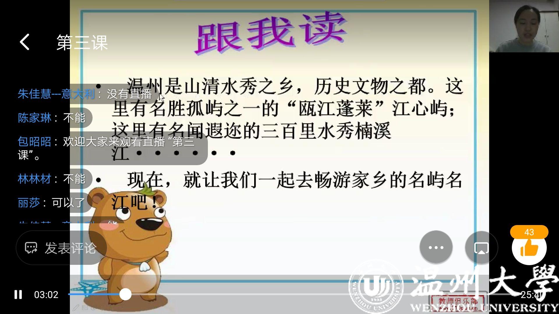 伴随着温州话版 “温州欢迎你”动听的歌声,美丽温州的画面缓缓呈现在孩子们的面前。通过云端网课的方式,孩子们好像在经历一场奇幻旅行,感受到了楠溪江、雁荡山大气豪迈,也体会到了南麂岛的小巧精致。网络,让孩子们即使身处异国他乡,也能将温州的青山绿水、大街小巷尽收眼底。