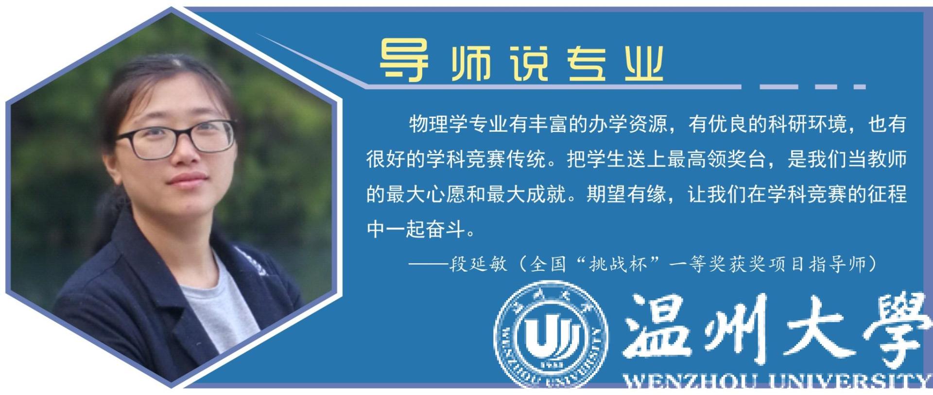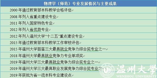 物理学(师范)专业是国家特色专业,也是温州大学老牌优势专业之一,有着深厚的办学积淀:1960年开始招收培养物理学专科生,1977年恢复高考当年继续招收培养物理学专科生,1987年开始招收培养物理学本科生,2004年开始招收培养凝聚态物理硕士研究生,2007年开始招收培养课程与教学论(物理)硕士研究生,2015年开始招收培养学科教学(物理)专硕研究生,2018年获得物理学一级学科硕士学位授予权。
