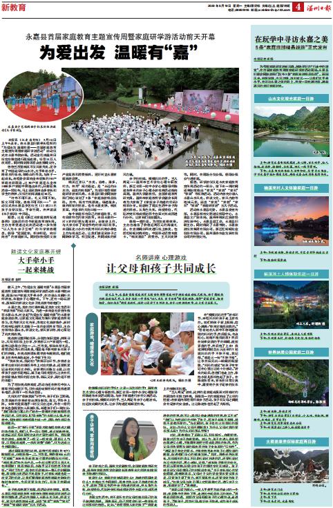 前天上午,永嘉县首届家庭教育主题宣传周暨家庭研学游活动启动仪式现场,除了简短热烈的启动仪式外,主办方为进一步普及“以人为本 亲子互哺”的家教理念,倡导“爱国爱家、相亲相爱、向好向善”的家庭新风,还精心设计了名师讲座、亲子心理游戏环节,让大家受益匪浅。