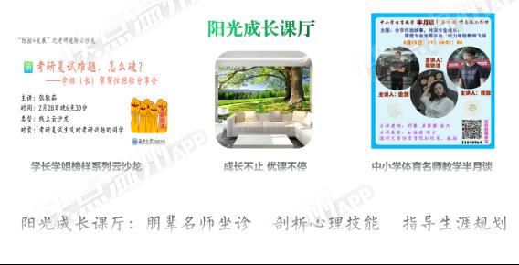 开展“阳光成长课厅”活动。针对疫期特需专题,针对严峻就业形势,引入菜鸟职场情商成长、地方教育局中小学半月谈、学长考研专题云沙龙、学者榜样示范学等学生成长相关活动,激发学生职涯潜能,补足个人短板,对齐行业标兵,生动引导“宽视野”“高质量”就业。