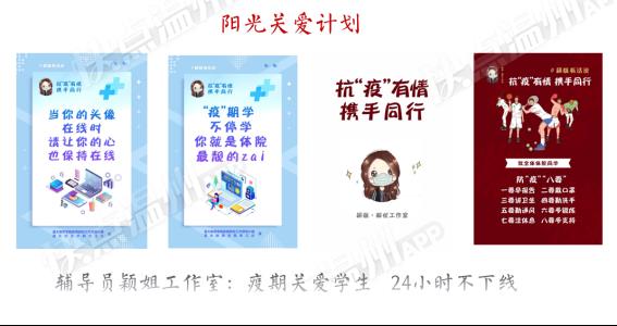实施阳光关爱计划。依托颖姐辅导员工作室,针对学习、心理、经济、毕业困难生库对象,预见性建立分类学生成长手册,依托不同专业突击队员力量,积极关注不同心理状况等级学生,依需逐级排查,做到24小时不下线,有效防控疫期学生心理健康风险。