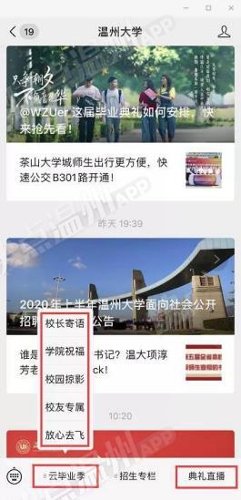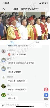 据悉,为了让受疫情影响不能到场的毕业生感受到毕业氛围,温州大学微信公众号同步上线2020年“云毕业典礼”,作为本次线下毕业典礼的延伸。“云毕业典礼”分为校长寄语、学院祝福、校园掠影、校友专属、放心去飞等5个版块,为广大毕业生提供了丰富的毕业季线上资源,营造了浓郁的毕业氛围。