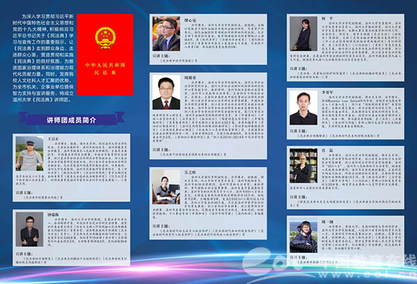 据介绍,为深入学习贯彻落实习近平总书记关于切实实施民法典的重要讲话精神,推进民法典普法宣传工作,温州大学充分发挥法学人才汇聚的专业学科优势,遴选了来自该校法学院相关领域的13位专家学者,组建民法典普法讲师团,讲师团的专家学者们精心准备了《民法典中的商事法问题》《民法典编纂技术的中国特色》《民法典总则编的十大创新规定》《民法典侵权责任编的热点问题解读》《民法典中的涉侨条款》《民法典下的劳动关系调整与劳动合同制度》等系列“金课”,为校内师生和校外各企事业单位开展民法典普法宣讲活动,温州大学的专家学者将走进机关、学校、企事业单位、军营、村镇街道等基层一线,开展系统化、常态化的普法宣讲,使民法典走到群众身边、走进群众心里。