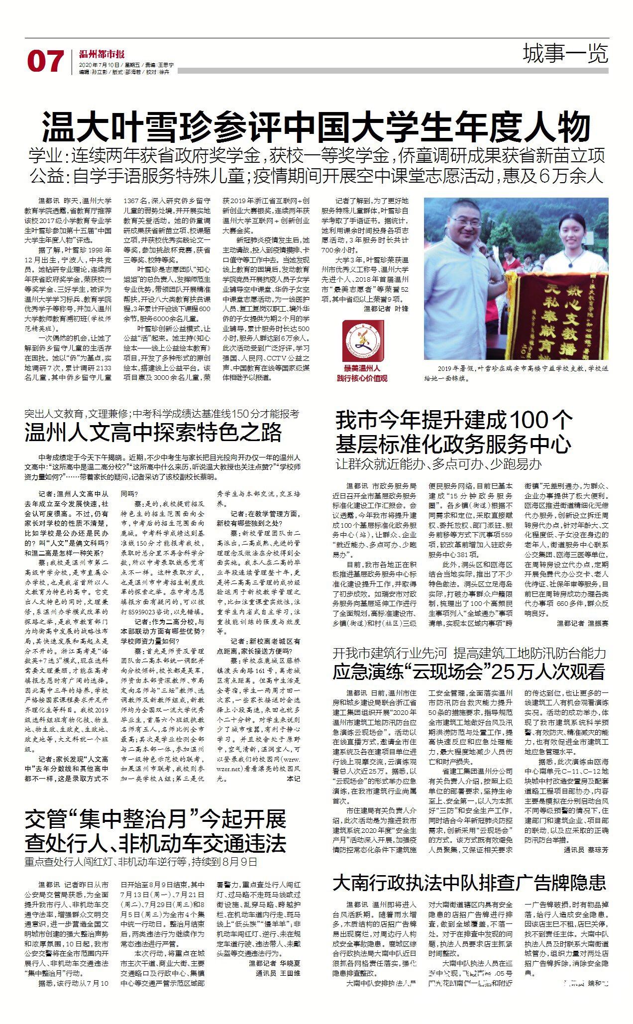 昨天,温州大学教育学院透露,省教育厅推荐该校2017级小学教育专业学生叶雪珍参加第十五届“中国大学生年度人物”评选。