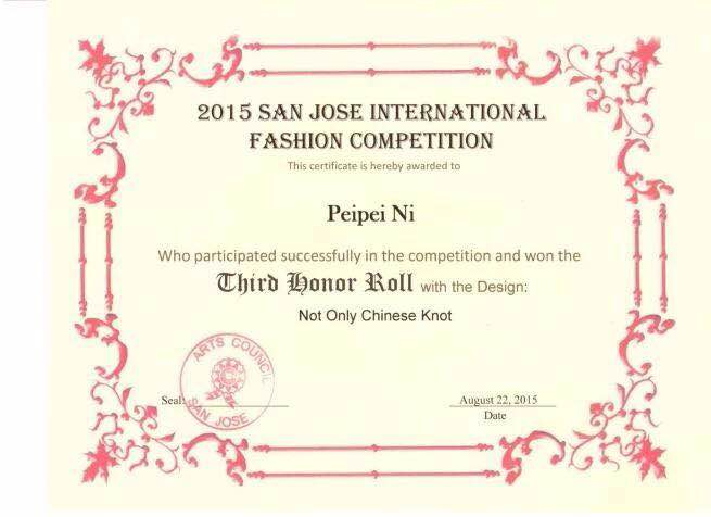 在2015年8月举办的美国圣荷西首届国际时装设计大赛中,作品《not only Chinese knot》荣获最高奖项,作品《冰岛童话镇》荣获最佳现代时尚奖,作品《红豆生南国》获优秀奖。
