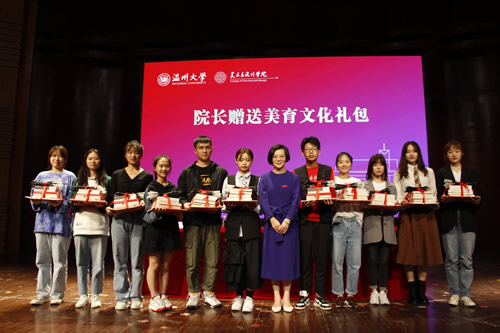 9月27日下午,在温州大学美术与设计学院2020级新生开学典礼上,11名新生代表从院长谢子静手中接过装有毛笔、字帖、瓯文化丛书、艺术等书籍的美育文化大礼包,沉甸甸的文化礼包让这些校园新萌们倍感新鲜,也颇感责任。
