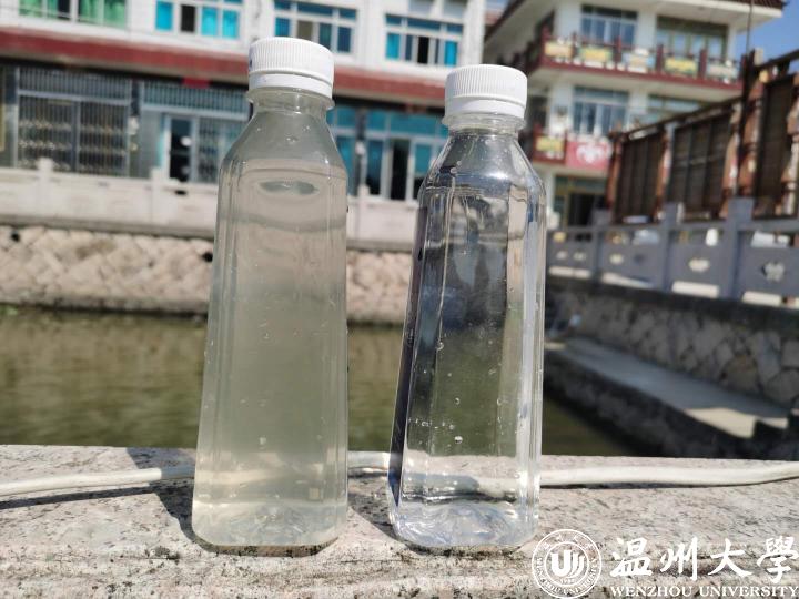 10月12日,温大技术人员现场演示:左边的水是侯宅南河进水口舀出的水,右边清澈的是经过生态砾石床过滤后的水。