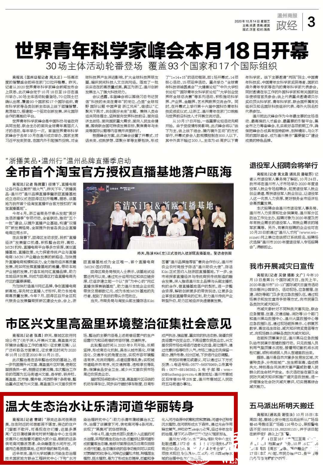 近半年来,温州大学城镇水污染生态治理技术国家地方联合工程研究中心(下称“水污染治理研究中心”)助力乐清市蒲岐镇治水工作,治理了该镇埭下河、侯宅南河等4条河流,实现了“黑臭河”的华丽转身。10月12日,本报记者跟随工作人员前往实地探访。