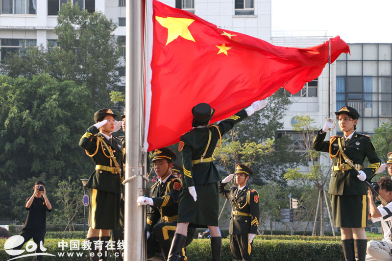 10月1日上午7点30分,迎着朝阳,伴随着雄壮的国歌声,在温州大学国旗护卫队的护卫下,鲜艳的五星红旗冉冉升起在校园里。