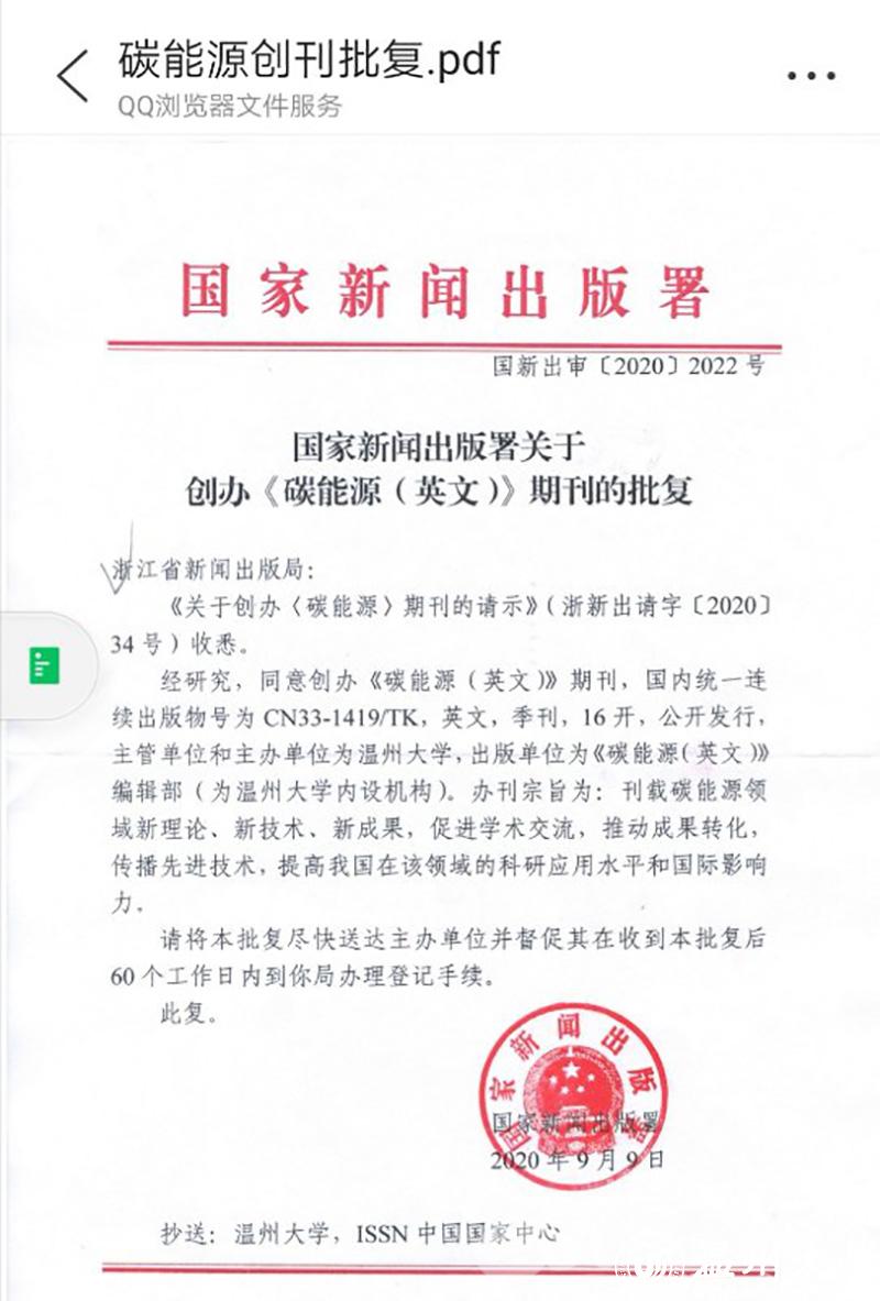 近日,温州大学收到国家新闻出版署下发的批复(国新出审[2020]2022号),同意《碳能源(英文)》(Carbon Energy)期刊公开发行,国内统一连续出版物号为CN33-1419/TK, 英文,季刊,16开。主管单位、主办单位均为温州大学,出版单位为《碳能源(英文)》编辑部(为温州大学内设机构)。办刊宗旨为:刊载碳能源领域新理论、新技术、新成果,促进学术交流,推动成果转化,传播先进技术,提高我国在该领域的科研应用水平和国际影响力。