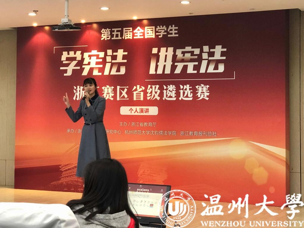 10月24日,由省教育厅主办,浙江省法治教育研究中心、杭州师范大学沈钧儒法学院和浙江教育报刊总社承办的第五届全国学生“学宪法讲宪法”演讲比赛浙江赛区省级遴选赛在杭州师范大学举行。比赛现场,选手们用激情饱满的语言,全方面多角度地阐释了对宪法价值和宪法精神的认识与理解。经过主题演讲和命题演讲两轮紧张比拼,来自温州大学法学院的大三学生齐倩凌最终脱颖而出,斩获高校组第一名,并将代表浙江出战全国总决赛。