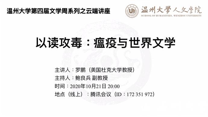 10月21日晚八点,温州大学第四届文学周系列之云端讲座——以读攻毒:瘟疫与世界文学在线上举行。瘟疫除了作为一种公共卫生危机之外,还隐射了人类的某种“病态”生存方式,成为了一种世界隐喻和寓言式的故事。