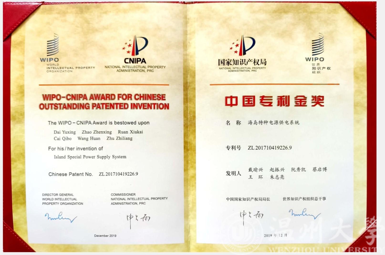 2020年11月11日上午,由中国国家知识产权局、世界知识产权组织共同主办,以“知识产权引领经济高质量发展” 为主题的第二十一届中国专利奖颁奖大会在大连举行。会上30项中国专利金奖受到表彰,温州大学电气与电子工程学院戴瑜兴教授前往领奖。国家知识产权局局长申长雨,世界知识产权组织中国办事处主任刘华,辽宁省委副书记、省长刘宁等领导出席会议。世界知识产权组织(WIPO)总干事邓鸿森发表了视频致辞。