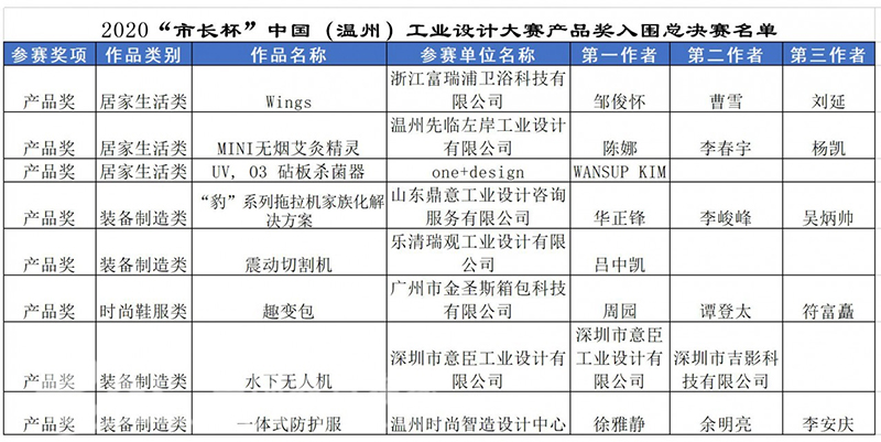 据悉,此次入围决赛的18件作品,将在2020年“市长杯”中国(温州)工业设计大赛的官网进行公示(http://wzszb.66wz.com/),并于11月份下旬举办总决赛路演及颁奖典礼。