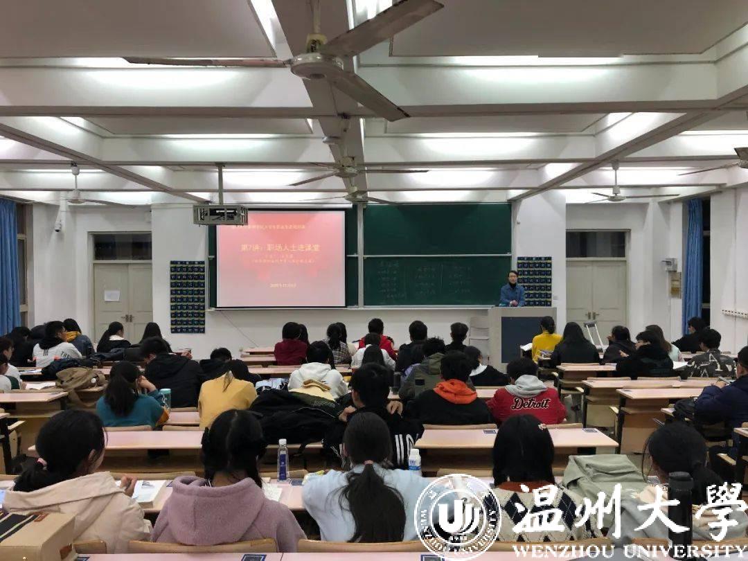 12月6日,新华保险温州中支人力资源总监朱秀薇应邀为温州大学数理学院2020级应用统计学专业新生讲授保险业的职场生活,受到了同学们的热烈欢迎。