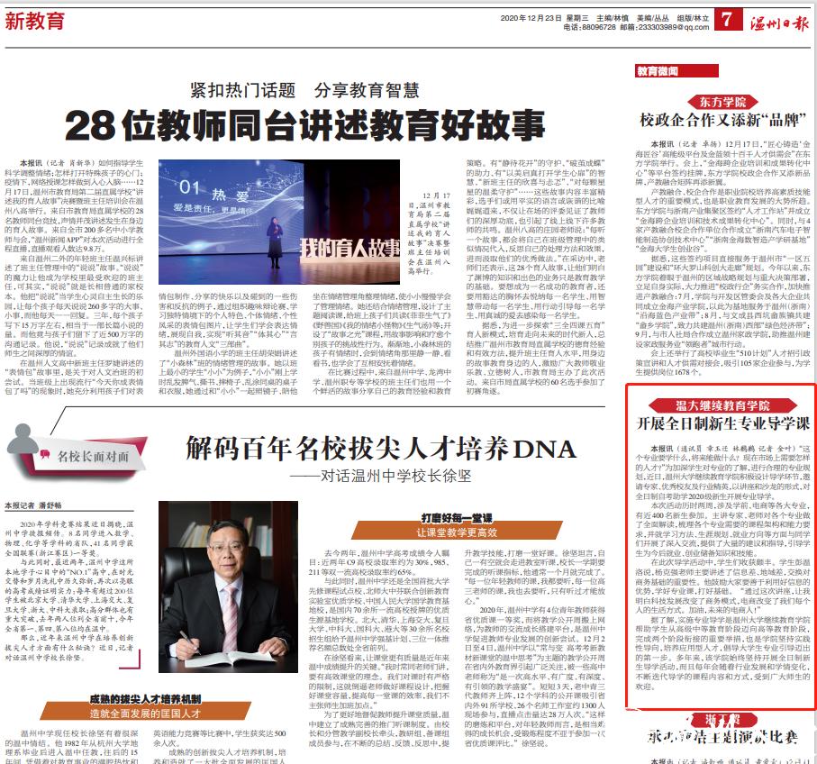 “这 个专业要学什么,将来能做什么?现在市场上需要怎样 的人才?”为加深学生对专业的了解,进行合理的专业规 划,近日,温州大学继续教育学院积极设计导学环节,邀 请专家、优秀校友及行业精英,以讲座和沙龙的形式,对 全日制自考助学2020级新生开展专业导学。