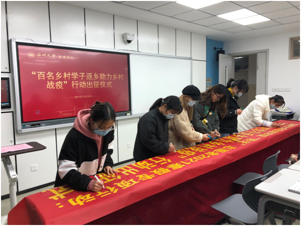 为了加强大学生对农村战疫工作的责任感与使命感,1月19日,数理学院还隆重举行了“百名乡村学子返乡助力乡村战疫”专项行动出征仪式。仪式上,除了领导致辞、学生代表发言等环节之外,还专门邀请了医务人员对大学生进行卫生安全培训,为学生赠送了口罩、消毒液等防护用品,确保大学生能在维护自身安全的前提下参加乡村疫情防控工作。仪式还通过宣誓、签名等环节,来强化大学生的社会责任。