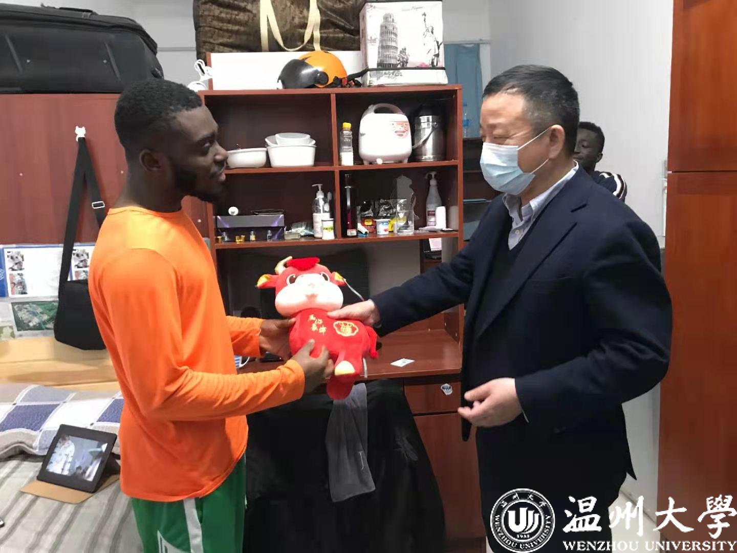 谢树华在寝室向留学生送上新年的问候和美好的祝愿,嘱咐大家要牢记和遵守疫情防控要求,保护好自身健康,利用假期时间多学习中文,学习中国文化,学习专业知识,不断充实自己。要和远在异国他乡的家人保持联系,让家人了解自己在温州大学生活学习情况,让家人放心;要和老师多多交流学业上和生活上的疑惑、困惑,不断获得成长。