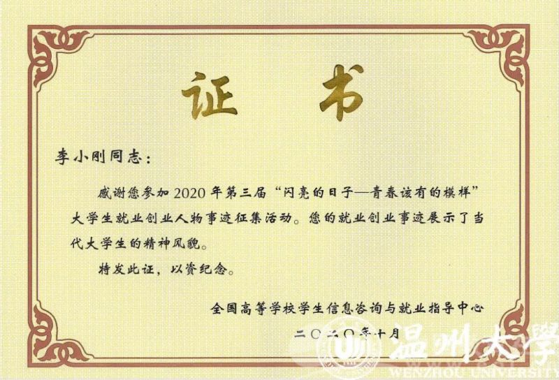 李小刚入选全国第三届“闪亮的日子——青春该有的模样”大学生就业创业人物