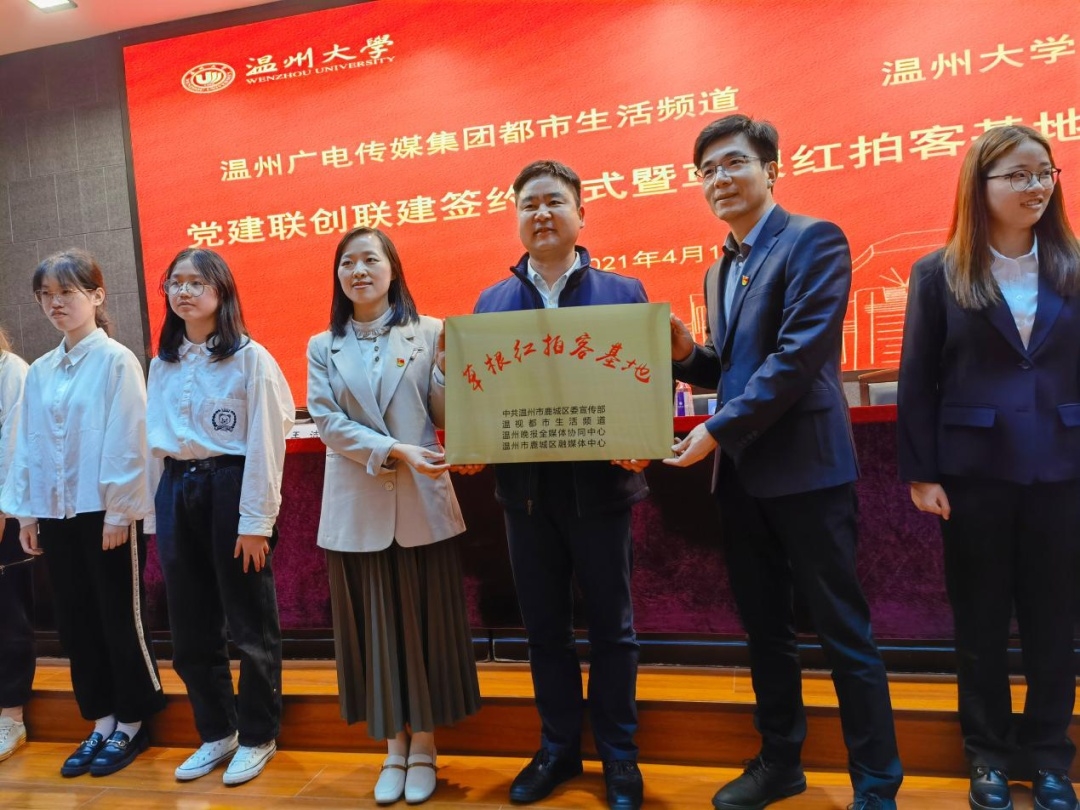 温州大学数理学院与温州广电传媒集团都市生活频道两家单位在温州大学岩松堂举行基层支部联盟共建签约暨草根红拍客基地授牌仪式,携手奏响“支部共建”的好声音。双方将遵循“党建引领、平台共享、活动创新、关系融洽”的原则,发挥各自优势,用手机镜头讲好当代大学生的故事,唱响“温州数学家之乡”好声音,献礼建党100周年。