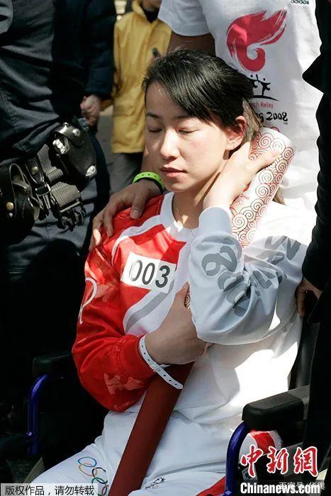 ▲当地时间2008年4月7日,北京奥运圣火在境外传递时遭遇干扰,中国残奥会击剑运动员金晶坐在轮椅上紧紧保护着熄灭的奥运火炬。(中新网资料图片)