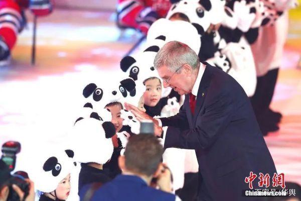 ▲2020年9月17日,北京2022年冬奥会吉祥物和冬残奥会吉祥物发布活动在北京举行。图为国际奥委会主席巴赫在发布活动上与小演员互动。(中新社资料图片 富田摄)