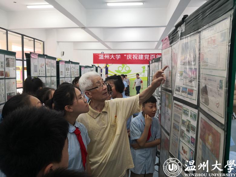 “这张邮票纪念的是中国共产党的诞生。1921年7月,中共一大在上海召开,最后一次会议转移到嘉兴南湖的游船上……”日前,“庆祝建党百年”老干部专题集邮巡展在温州大学育英图书馆举办,邮展作者、温州大学退休老干部、90高龄的林选青、周瑾老同志,以及他们所在离退休党支部中前来担任讲解志愿者的张汝潮、姜苏宾、陈康硕等同志,与现场师生和嘉宾亲切互动。