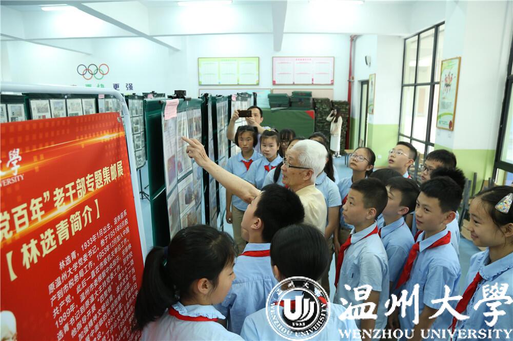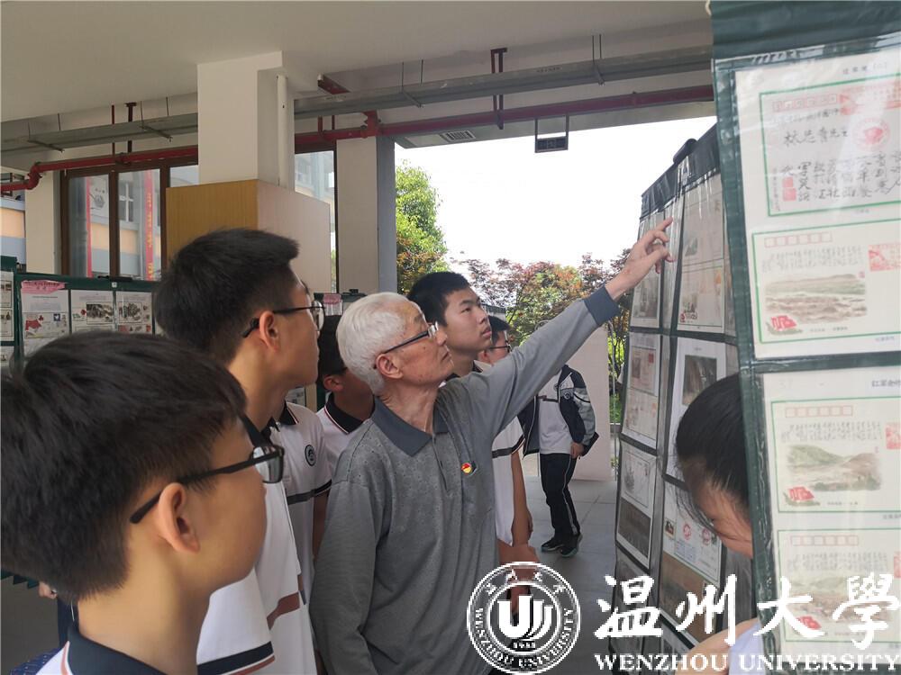 邮展作者,是温州大学退休老干部、90高龄的林选青、周瑾,讲解志愿者张汝潮、姜苏宾、陈康硕,也是他们离退休党支部的老同志。据悉,林选青同志退休前系原温州大学党委书记,现任温州大学关工委副主任,周瑾同志退休前系原温州大学党委委员、党办主任。