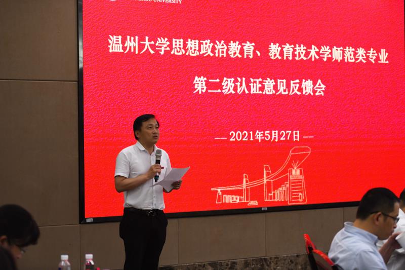 温州大学党委书记谢树华也作了回应讲话,他对专家组高质量完成本次进校考查任务表示崇高的敬意,并表示专家组提出的整改意见非常精准、针对性强,对温州大学所有师范专业内涵建设都有很好的借鉴意义。学校将以此次专业认证工作为新动力,以整改工作为抓手,推动学校特色内涵发展,加强专业内涵建设,系统构建符合认证标准要求的本科人才培养体系,推动温大整体专业建构水平和人才培养质量的提升。