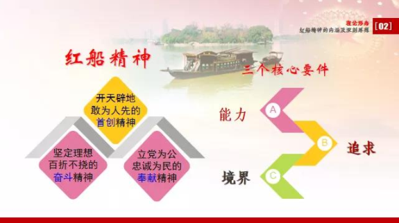 红船精神集中体现了中国共产党的建党精神,展现了中国革命精神之源、昭示着中国共产党的初心。徐老师说,从鸦片战争到甲午战争、从俄国十月革命到中国共产党建党、从上海一大会址、嘉兴南湖红船,一代代中国共产党人他们舍弃了小家为大家,舍弃了小我为大我,他们以红船精神为指引,坚定理想信念,发杨首创、奋斗、奉献的能力、追求和境界,为人民谋幸福、为民族谋复兴,在百年的历史进程中引领着中国社会不断的披荆斩棘、向前发展。