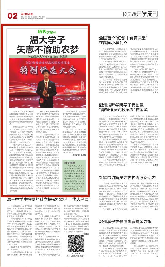 除了在校园内、课堂上汲取专业知识外,张嘉诚还借助温州大学为学生们搭建的各类实践平台,不断提升、锤炼自己的社会实践能力。他参与撰写的《完善“新农合”以促进乡村振兴》的调研报告被温州市供销社采纳并用于实践,提出的修改意见获得时任省、市领导的批示与肯定。