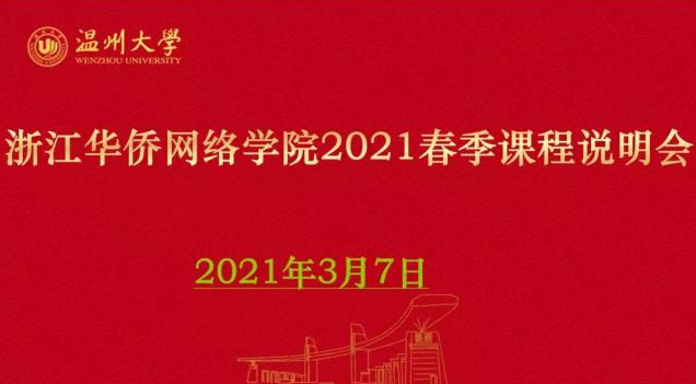 浙江华侨网络学院在省侨办、侨联与温州大学共同筹建下于2020年7月授牌成立。自成立以来,学院积极整合海内外华人资源,为海内外侨胞量身定制设计课程,全力打造海外侨胞爱用、好用、管用的为侨服务网络学习平台,成为全球华侨华人的“加油站”。2021年2月,浙江华侨网络学院获评“2020年度全省侨联系统“最具影响力工作。